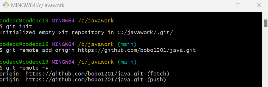 → 'git init' (폴더에 git 생성)→ 'git remote add origin 연결할 깃 허브 주소'를 입력합니다.