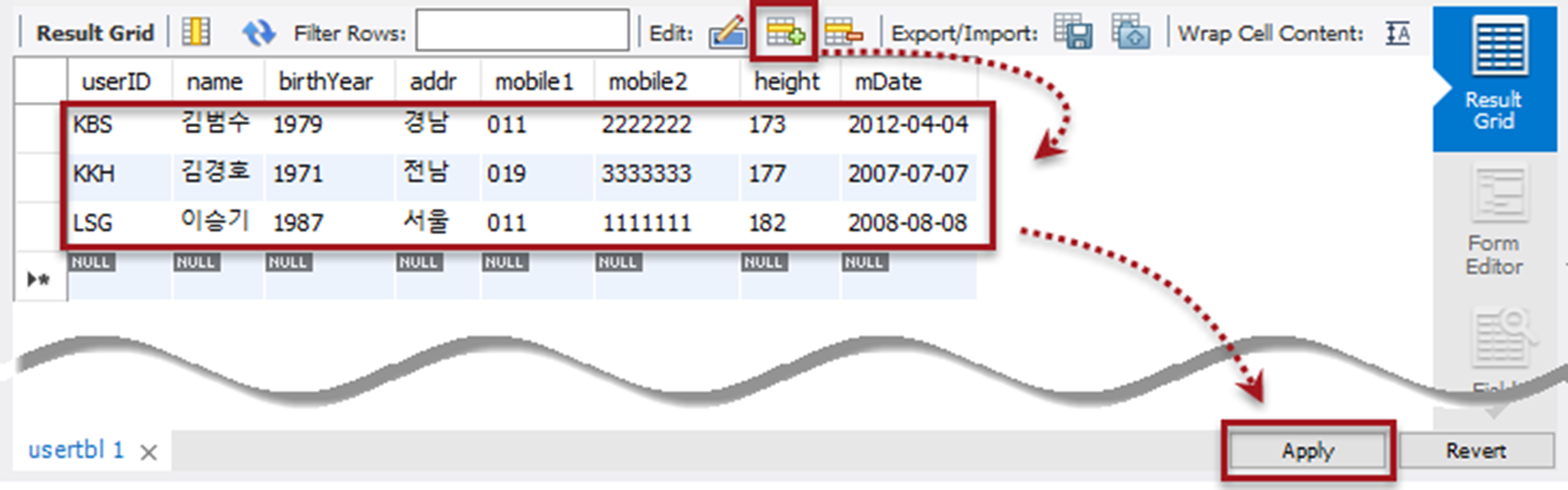 1. MySQL Workbench에서 테이블 생성 ▷ Navigator – [Schemas] 클릭 – ‘tabledb’ 확장 – ‘Tables’ 마우스 오른쪽 버튼 – [Create Table] 선택 ▷ usertbl 생성 ▷ buytbl 생성 ▷ num열에 AUTO_INCREMENT, FOREIGN KEY 추가 2. MySQL Workbench에서 데이터 입력 ▷ Navigator에서 usertbl 선택 – 마우스 오른쪽 버튼 클릭 – [Select Rows – Limit 1000] 선택 ▷ <Insert new row> 아이콘 클릭한 후, 3개 행 입력 - <Apply> 클릭 - <Finish> 클릭