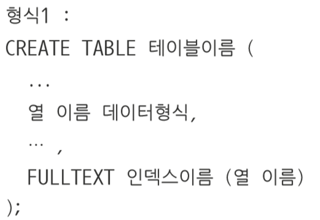 ◎ 전체 텍스트 인덱스(FULLTEXT Index) 생성 ▷ 텍스트로 이루어진 문자열 데이터의 내용으로 생성한 인덱스 ▷텍스트 인덱스 생성 형식