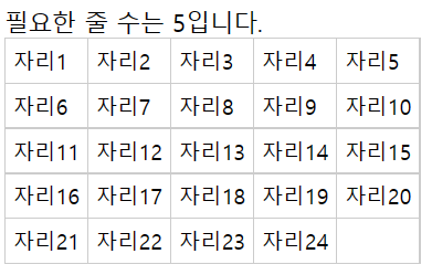 입장객 수와 한 줄에 몇 명씩 앉을 것인지 입력받고 총 몇 줄이 필요한지 계산하는 자리배치도를 만드세요.