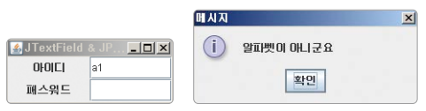 ▷ JPasswordField는 사용자의 입력을 다른 사람이 볼 수 없도록 숨긴다는 차이가 있음
