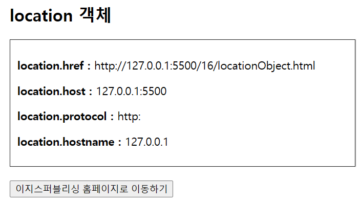 | 5 | location | 현재 페이지의 URL 정보가 담겨 있습니다. |