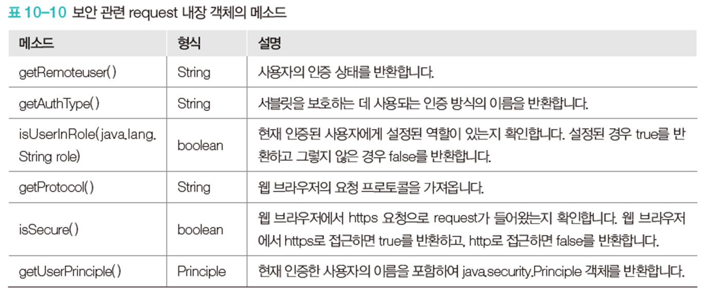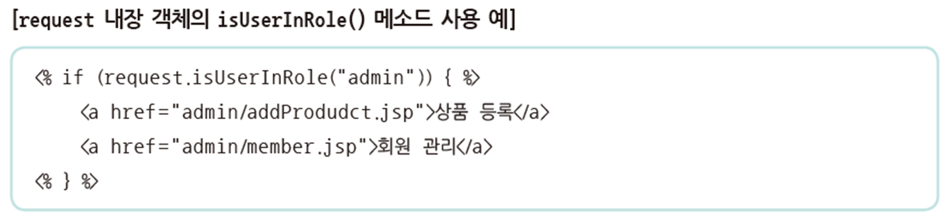 ▷ 선언적 시큐리티의 보안으로 충분하지 않을때 request 내장 객체의 메소드를 사용하여 사용자를 승인하는 방법