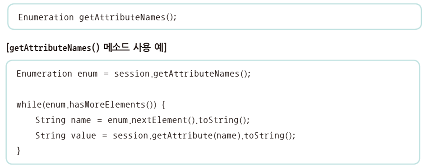 ▷ 세션에 저장된 하나의 세션 속성 이름에 대한 속성 값을 얻어오려면 getAttribute( ) 메소드를 사용