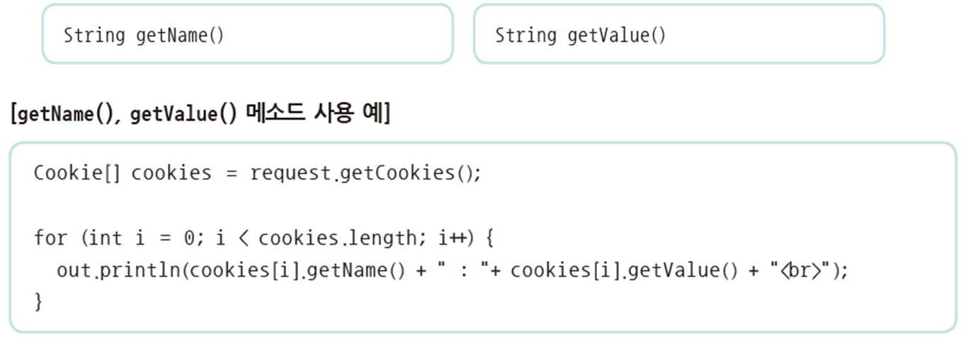▷ 쿠키 객체를 얻어왔다면 이 쿠키 객체에 저장된 쿠키 이름과 값을 가져오기 위해 getName( ), getValue( ) 메소드를 사용