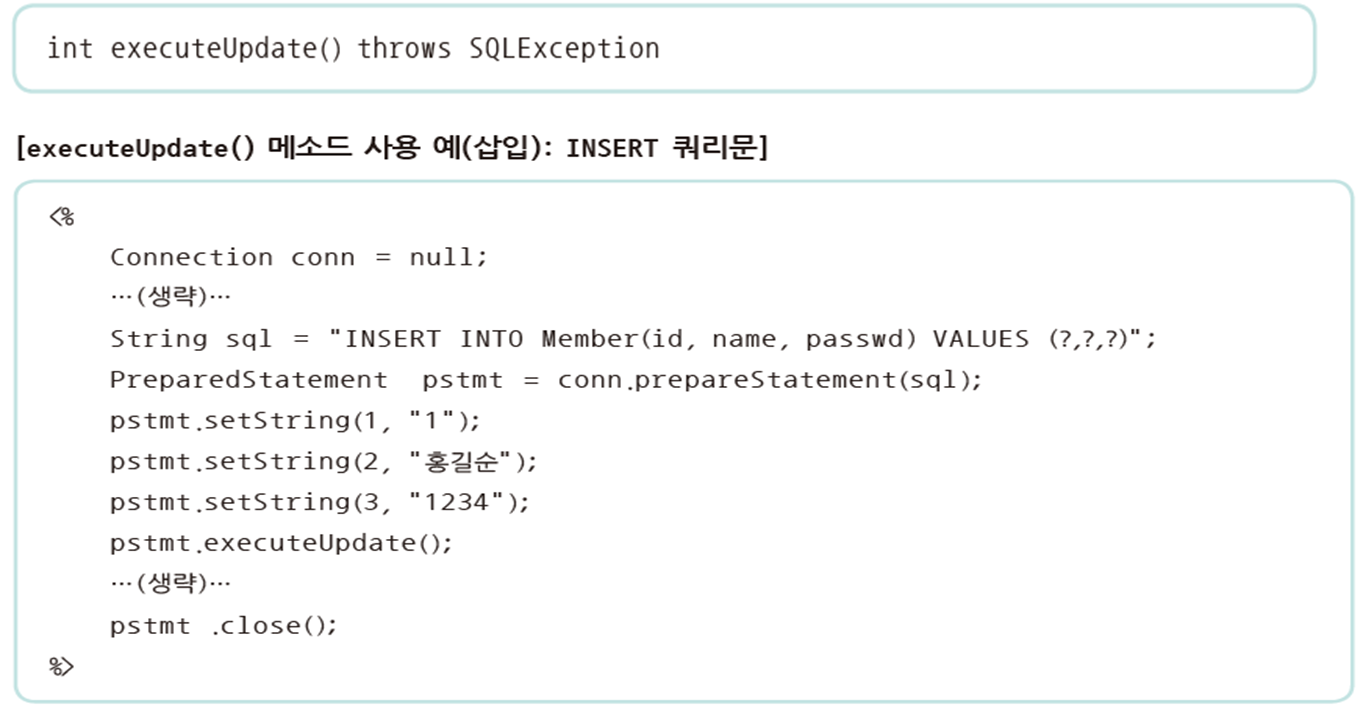 ▶ executeUpdate( ) 메소드는 INSERT, UPDATE, DELETE 쿼리문을 통해 데이터를 삽입, 수정, 삭제하는 데 사용