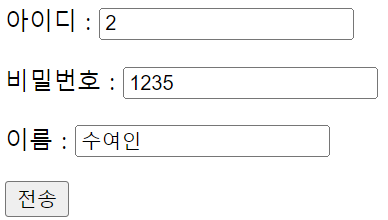 <%@ page language="java" contentType="text/html; charset=UTF-8" pageEncoding="UTF-8"%> <!DOCTYPE html> <html> <head> <meta charset="UTF-8"> <title>Database SQL</title> </head> <body> <form method="post" action="update02_process.jsp"> <p>아이디 : <input type="text" name="id"> <p>비밀번호 : <input type="text" name="passwd"> <p>이름 : <input type="text" name="name"> <p><input type="submit" value="전송"> </form> </body> </html>