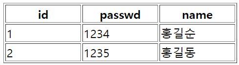 drop table member; create table member( id varchar(20) not null, passwd varchar(20), name varchar(30), primary key (id) ); insert into member values('1', '1234', '홍길순'); insert into member values('2', '1235', '홍길동'); select * from member;