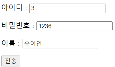 <%@ page language="java" contentType="text/html; charset=UTF-8" pageEncoding="UTF-8"%> <%@ taglib prefix="c" uri="http://java.sun.com/jsp/jstl/core" %> <%@ taglib prefix="sql" uri="http://java.sun.com/jsp/jstl/sql" %> <!DOCTYPE html> <html> <head> <meta charset="UTF-8"> <title>Database SQL</title> </head> <body> <form method="post" action="sql02_process.jsp"> <p>아이디 : <input type="text" name="id"> <p>비밀번호 : <input type="text" name="passwd"> <p>이름 : <input type="text" name="name"> <p><input type="submit" value="전송"> </form> </body> </html>
