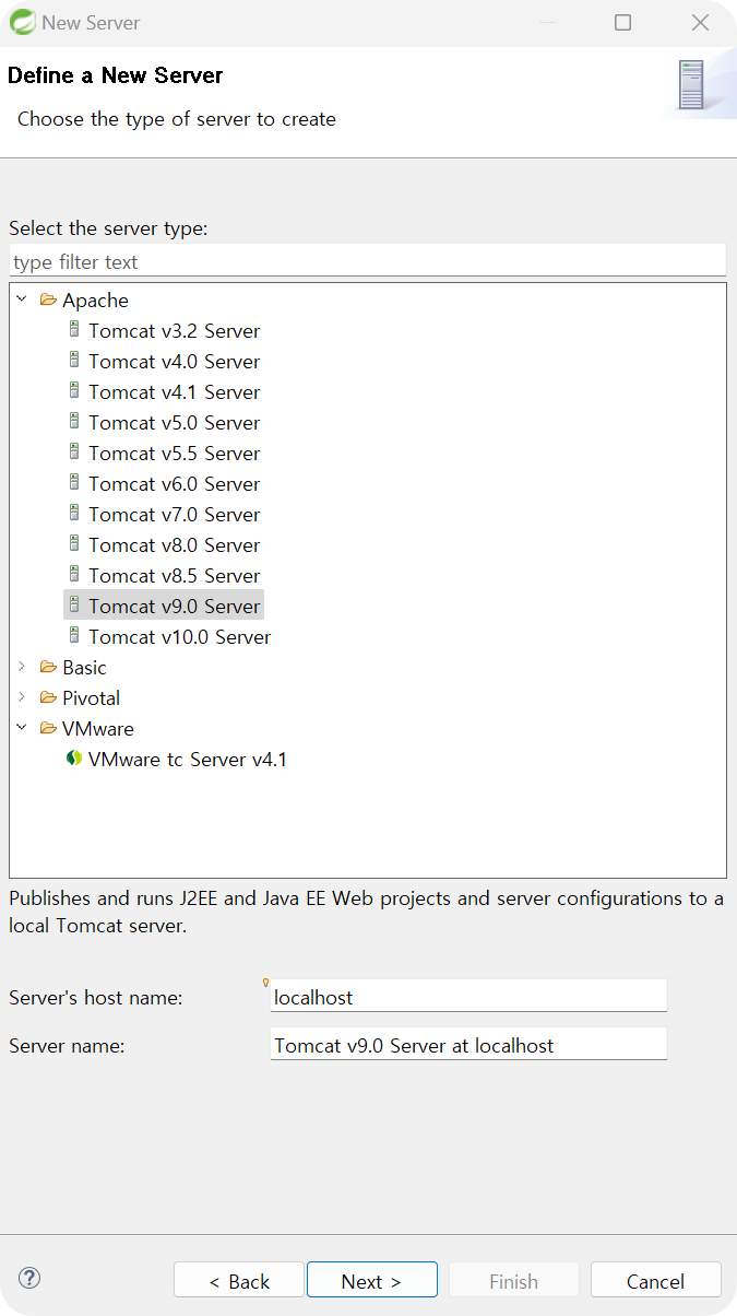 ◎ File → New → Other → Server → Server(더블 클릭) → 새로운 창 나타남 → Apache → Tomcat v9.0 Server → Next