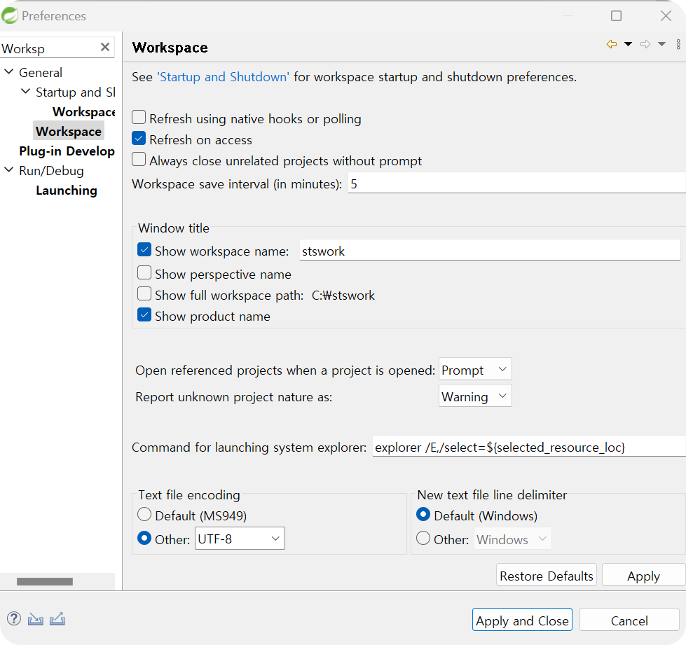 ◎ Window → Preferances → Workspace 설정 (Text file encoding : UTF-8로 변경)