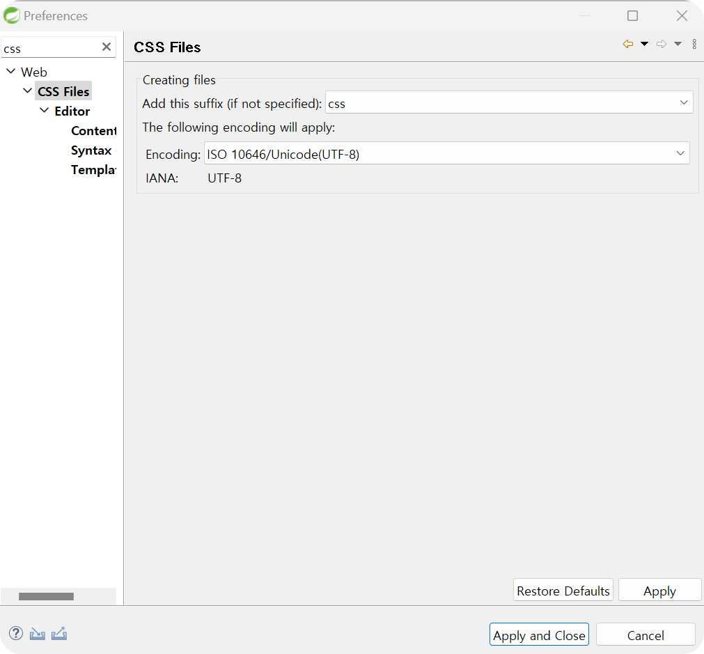 ◎ Window → Preferances → CSS Files 설정 (Encoding : UTF-8로 변경)