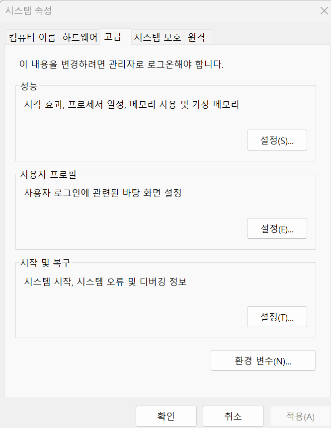▷ 시스템 → 고급시스템 설정 → 환경변수 → 시스템 변수의 JAVA_HOME 편집(자바 버전 변경)