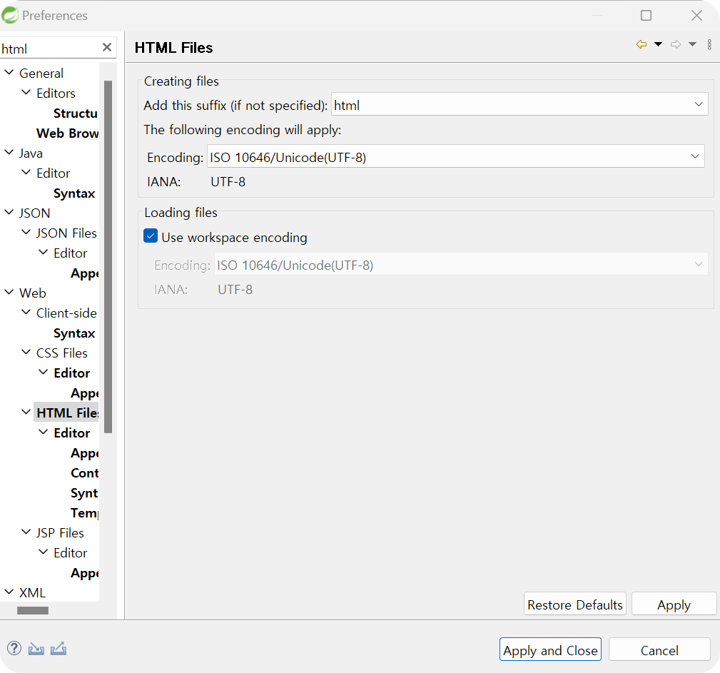 ◎ Window → Preferances → HTML Files 설정 (Encoding : UTF-8로 변경)