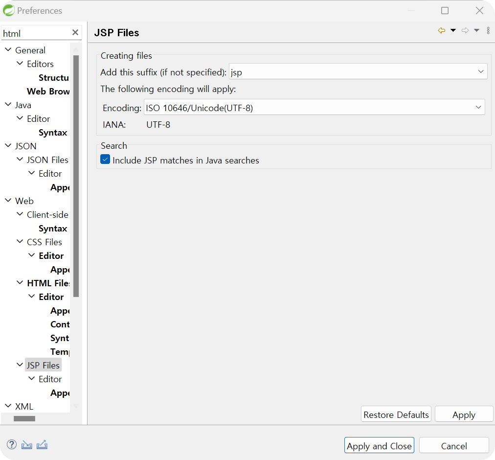 ◎ Window → Preferances → JSP Files 설정 (Encoding : UTF-8로 변경)