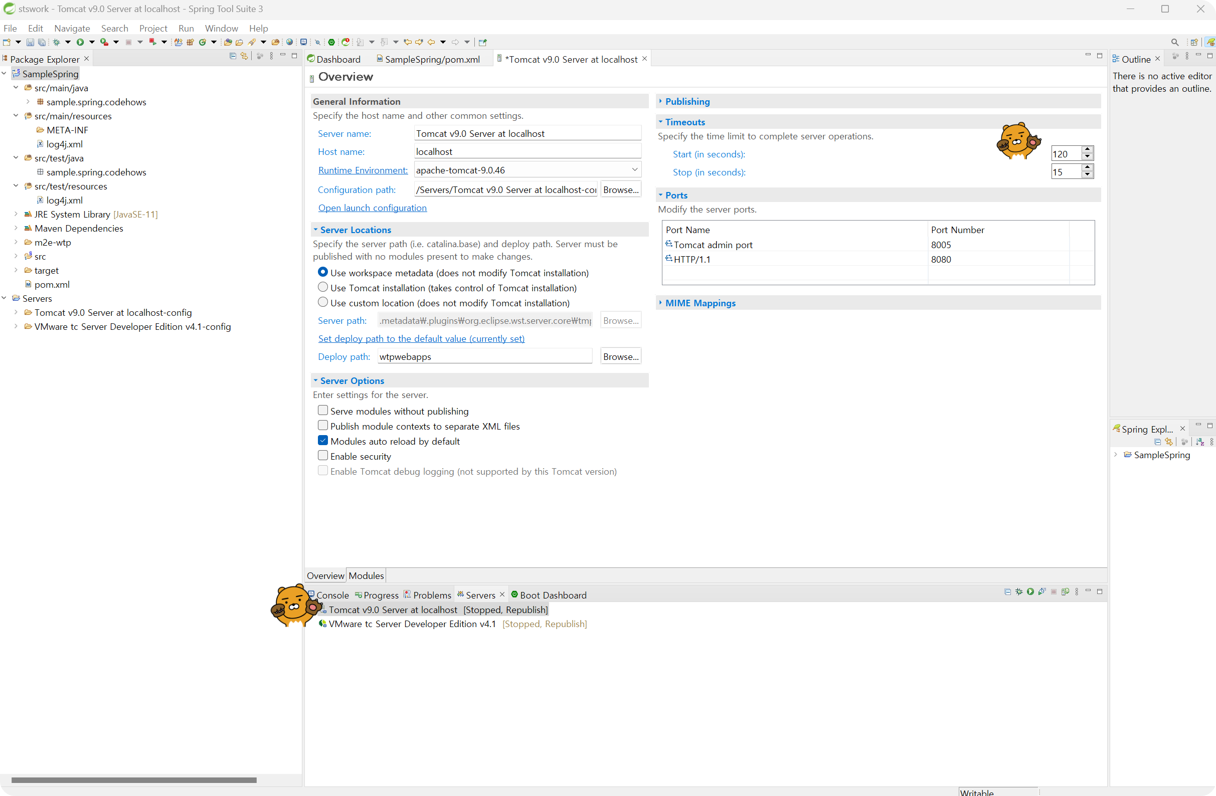 ◎ Tomcat 연결 후 아래의 tomcat 서버 더블클릭 → Timeouts Start : 120으로 변경