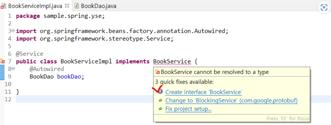 위와 같이 오류난 부분에 마우스를 올린 후 BookService 인터페이스를 만들어줍니다.