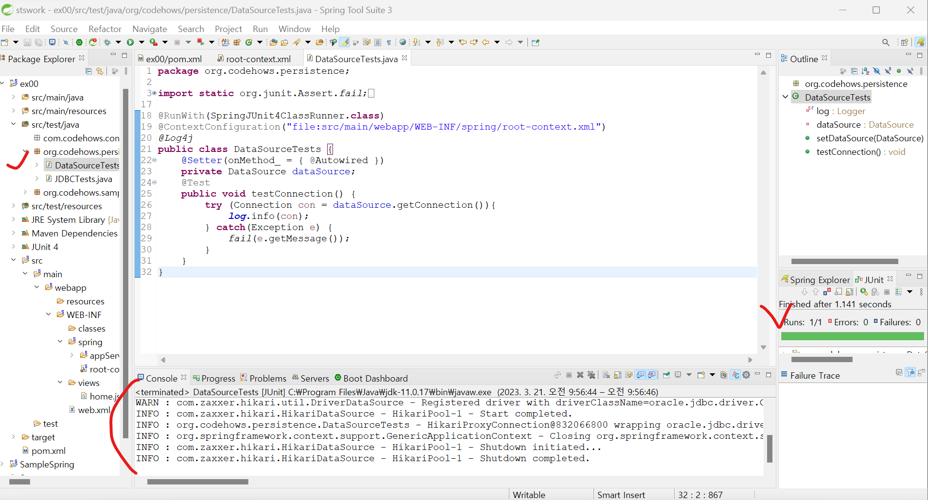 package org.codehows.persistence; import static org.junit.Assert.fail; import java.sql.Connection; import java.sql.DriverManager; import org.junit.Test; import lombok.extern.log4j.Log4j; @Log4j public class JDBCTests { static { try { Class.forName("oracle.jdbc.driver.OracleDriver"); } catch(Exception e) { e.printStackTrace(); } } @Test public void testConnection() { try(Connection con = DriverManager.getConnection( "jdbc:oracle:thin:@localhost:1521:XE", "book_ex", "book_ex")){ log.info(con); } catch(Exception e) { fail(e.getMessage()); } } }아래와 같은 결과가 나타나면 실행 성공입니다.