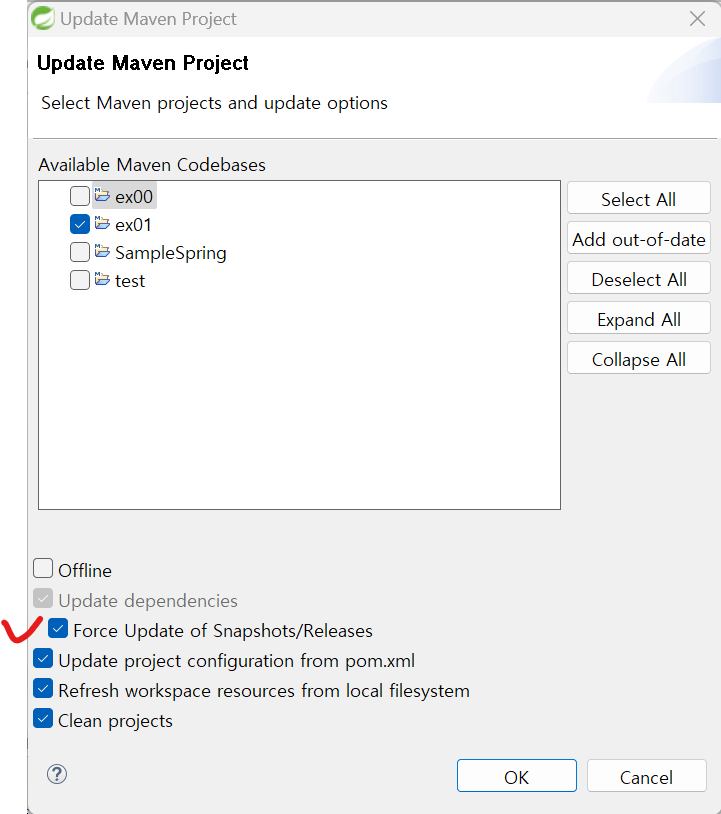 모든 설정 마친 후 ex01 우클릭 → Maven → Update Project → Force Update of Snapshots/Releases 선택 후 OK