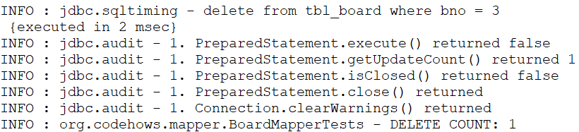 ...(생략)... @Test public void testDelete() { log.info("DELETE COUNT: " + mapper.delete(3L)); } }