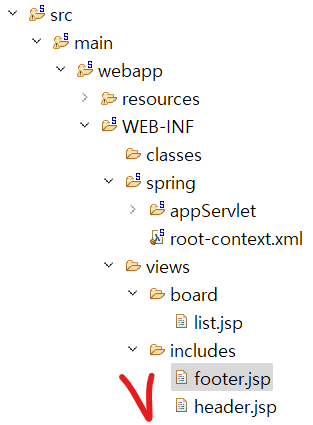 ▷ 현재 프로젝트 views 폴더에 includes 폴더 작성 후, header.jsp, footer.jsp 선언