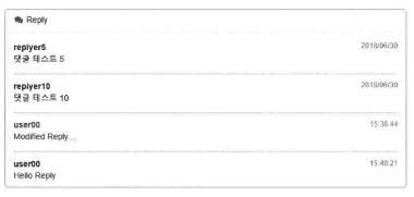 ... (생략) ... <div class="row"> <div class="col-lg-12"> <!-- /.panel --> <div class="panel panel-default"> <div class="panel-heading"> <i class="fa fa-comments fa-fw"></i> Reply //확인필요 </div> <!-- /.panel-heading --> <div class="panel-body"> <ul class="chat"> <!-- start reply --> <li class="left clearfix" data-rno='12'> <div> <div class="header"> <strong class="primary-font">user00</strong> <small class="pull-right text-muted">2023-03-30 11:30</small> </div> <p>Good job!</p> </div> </li> <!-- end reply --> </ul> <!-- ./ end ul --> </div> <!-- /.panel .chat-panel --> </div> </div> <!-- ./ end row --> </div> ... 생략 ...