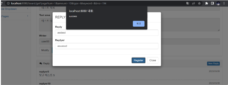 ▷ 새로운 댓글의 추가는 필요한 댓글의 내용(Reply)과 댓글의 작성자(Replyer) 항목만으로 추가해서 모달창 아래쪽의 'Register' 버튼을 클릭해서 처리함