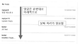 이벤트 처리와 HTML 처리 할 때 댓글의 목록 처리, 페이지 이동시 목록 호출, 시간 처리, 새로운 댓글 처리 등을 시행해봤습니다.