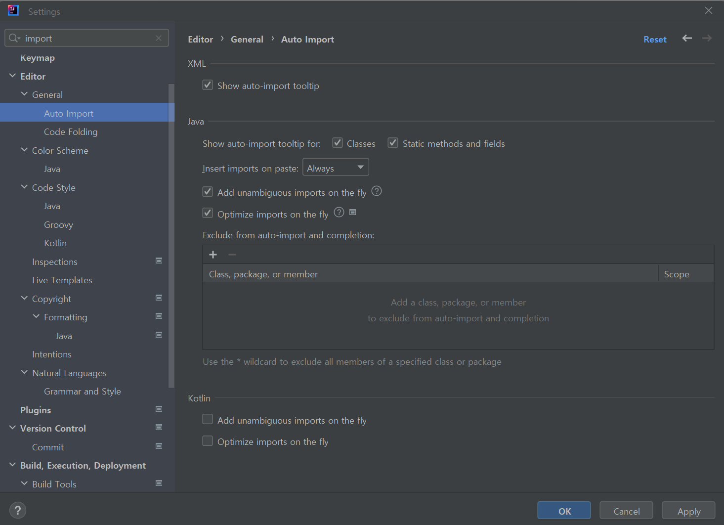 ◎ file → setting → Auto Import → 두 가지 체크 ▷ 두 가지 체크를 하면 단축키 안써도 자동 import가 됩니다.
