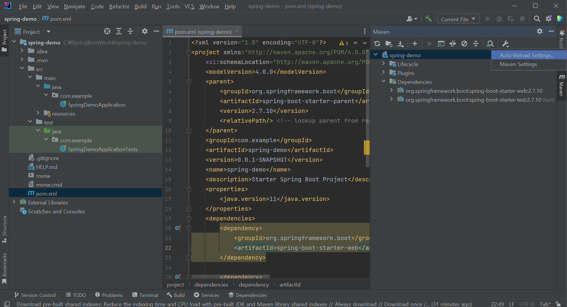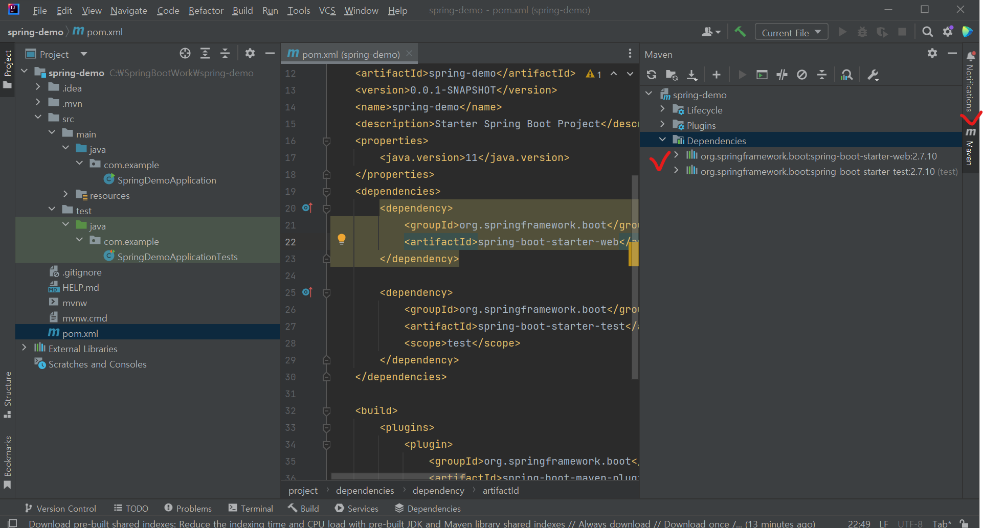 ▷ [Maven] 탭 선택 후 'Dependencies' 클릭하면 pom.xml에 추가한 'spring-boot-starter-web', ''spring-boot-starter-test' 의존성이 들어와 있는 것을 확인할 수 있음