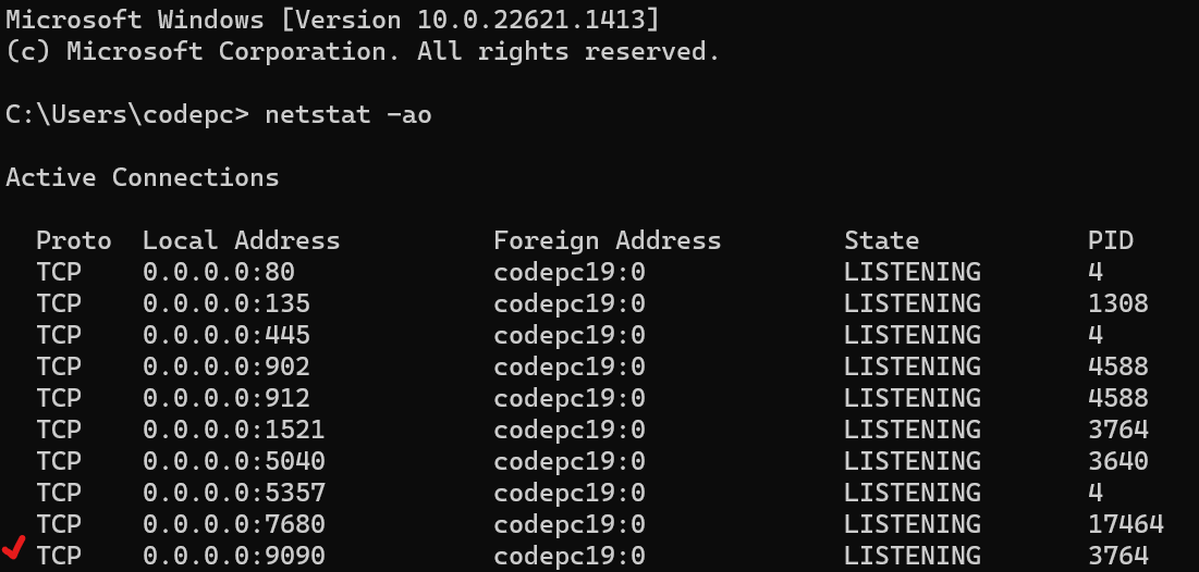 ◎ cmd창 netstat -ao ◎ 프로세스 죽이기 : taskkill /f /PID번호 ▷ taskkill /f /3764 ▷ 지금 실행하면 안됩니다!