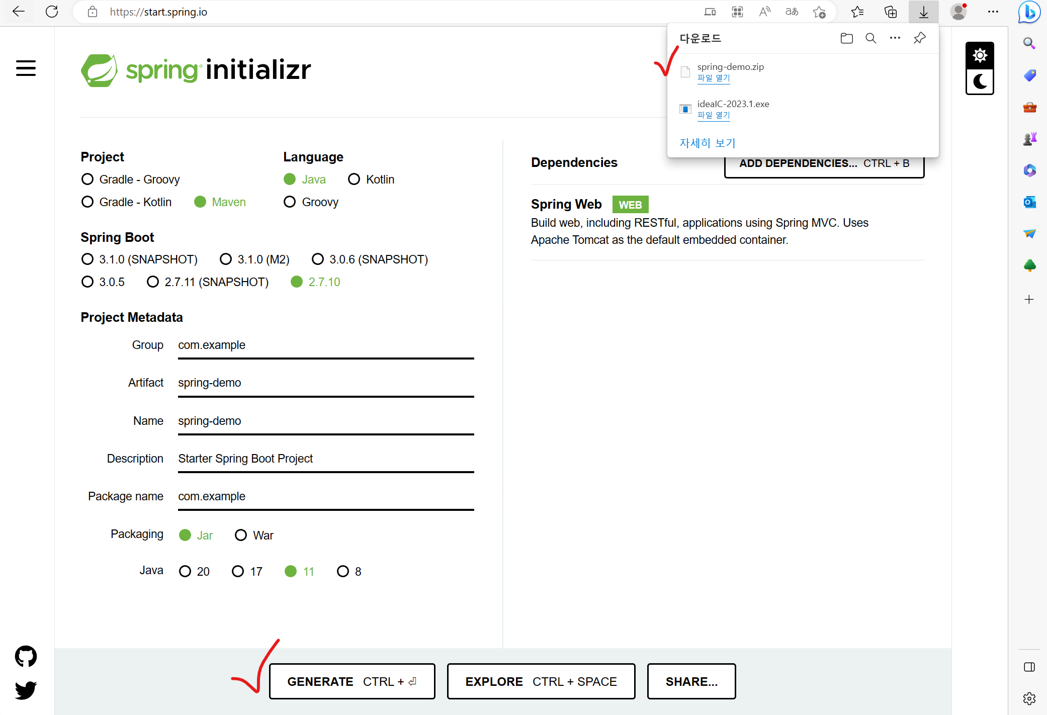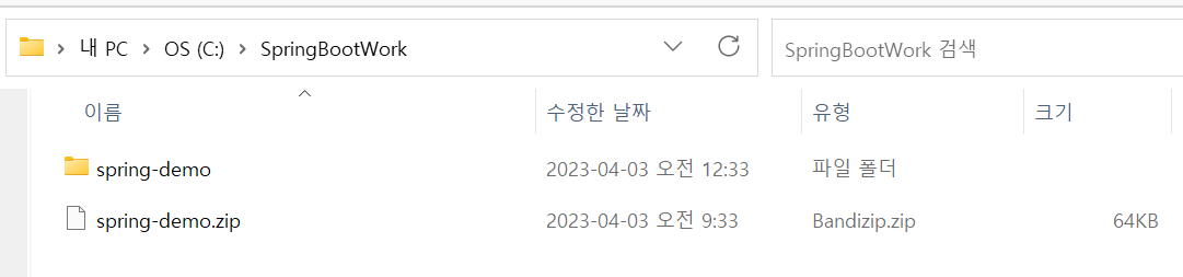 ◎ generate 하면 압축파일이 하나 만들어지고 조금 전 만들었던 C드라이브 SpringBookWork에 넣고 압축을 풀어줍니다.
