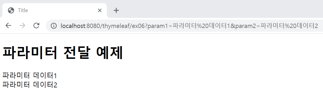 ...(생략)... @GetMapping(value = "/ex06") public String thymeleafExample06(String param1, String param2, Model model){ model.addAttribute("param1", param1); model.addAttribute("param2", param2); return "thymeleafEx/thymeleafEx06"; } }