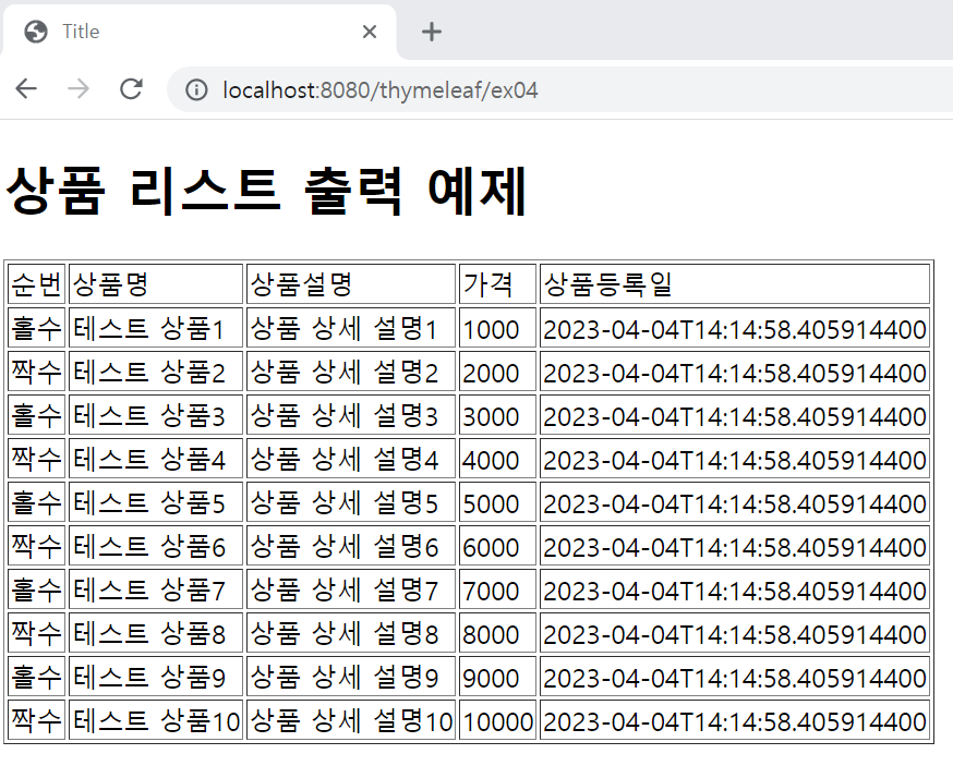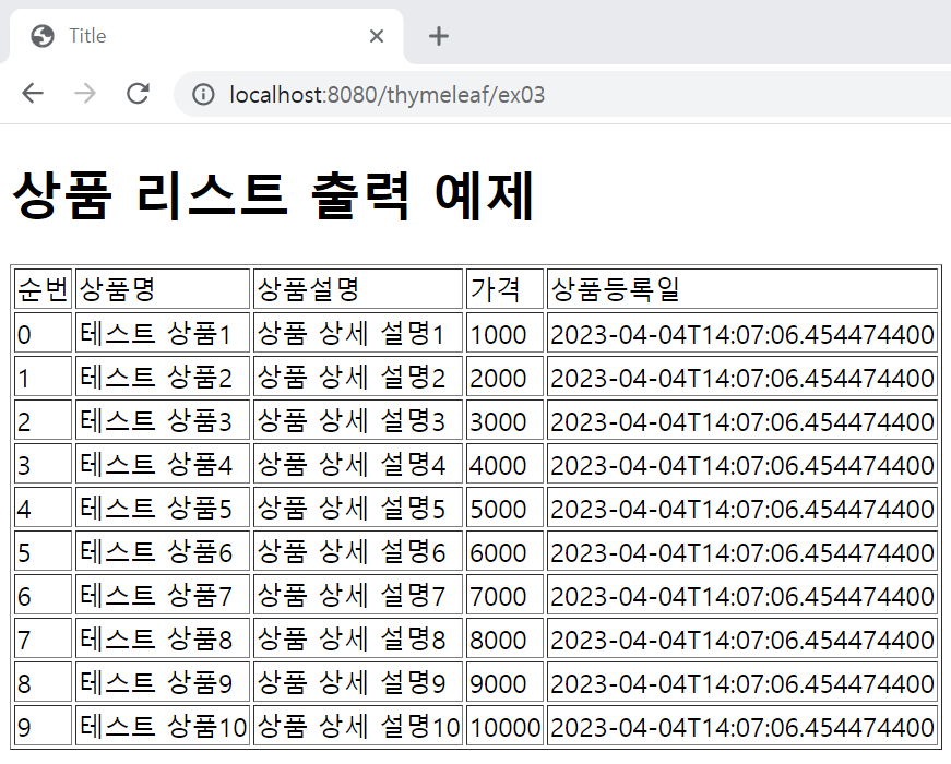 ...(생략)... @GetMapping(value = "/ex04") public String thymeleafExample04(Model model){ List<ItemDto> itemDtoList = new ArrayList<>(); for(int i=1; i<=10; i++){ ItemDto itemDto = new ItemDto(); itemDto.setItemDetail("상품 상세 설명" + i); itemDto.setItemNm("테스트 상품" + i); itemDto.setPrice(1000*i); itemDto.setRegTime(LocalDateTime.now()); itemDtoList.add(itemDto); } model.addAttribute("itemDtoList", itemDtoList); return "thymeleafEx/thymeleafEx04"; } }