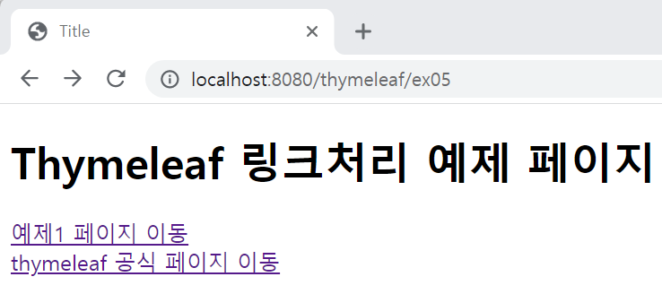 <!DOCTYPE html> <html xmlns:th="http://www.thymeleaf.org"> <head> <meta charset="UTF-8"> <title>Title</title> </head> <body> <h1>Thymeleaf 링크처리 예제 페이지</h1> <div> <a th:href="@{/thymeleaf/ex01}">예제1 페이지 이동</a> </div> <div> <a th:href="@{https://www.thymeleaf.org/}">thymeleaf 공식 페이지 이동</a> </div> </body> </html>