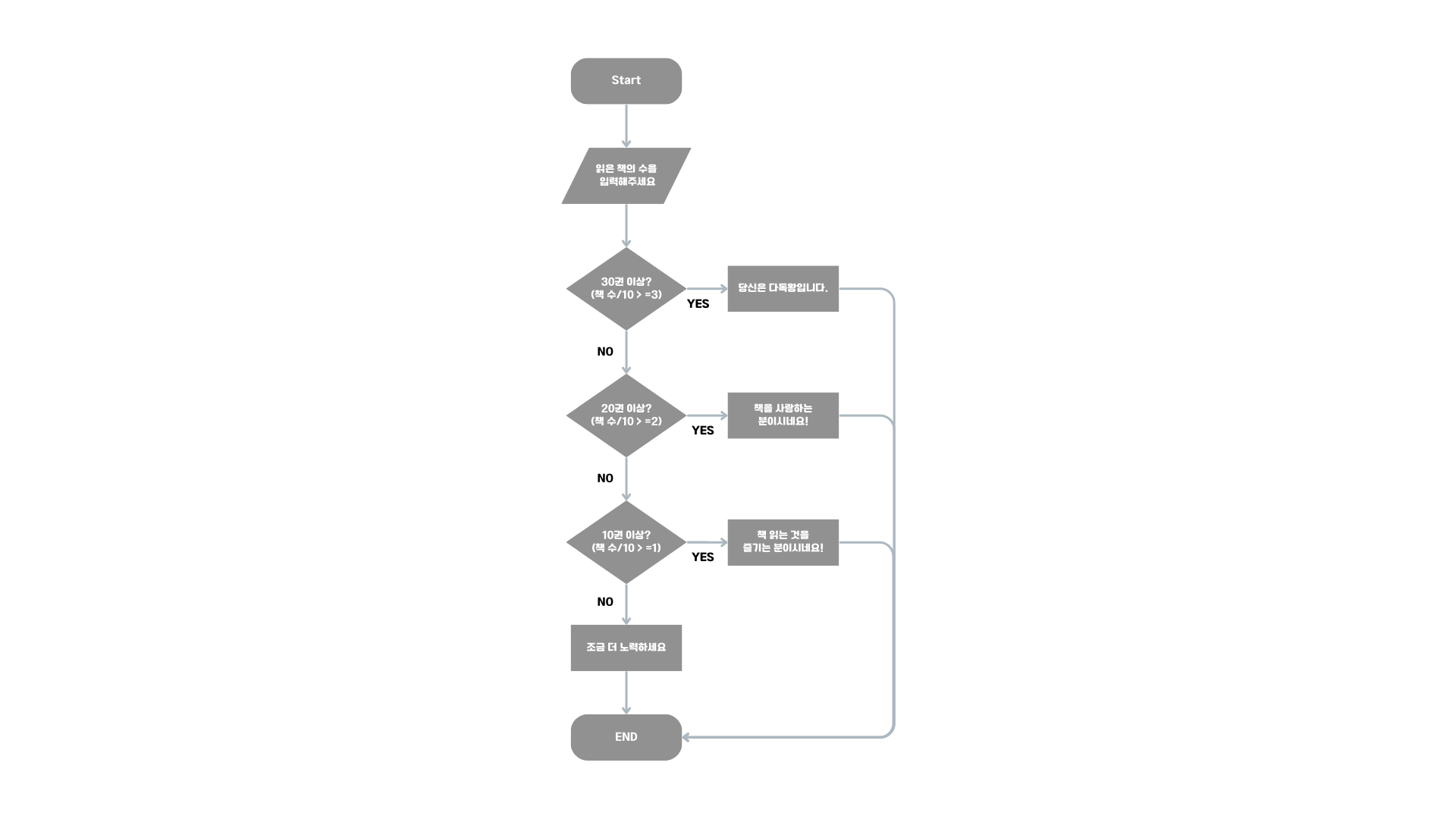 3-4) 모두 만족하지 않는다면 "당신은 다독왕입니다!" 문구 출력