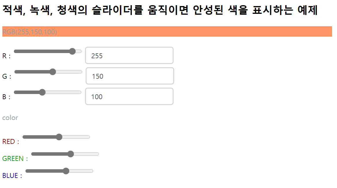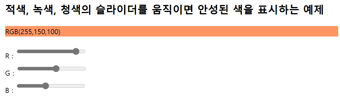 <h2>적색, 녹색, 청색의 슬라이더를 움직이면 완성된 색을 표시하는 예제</h2>