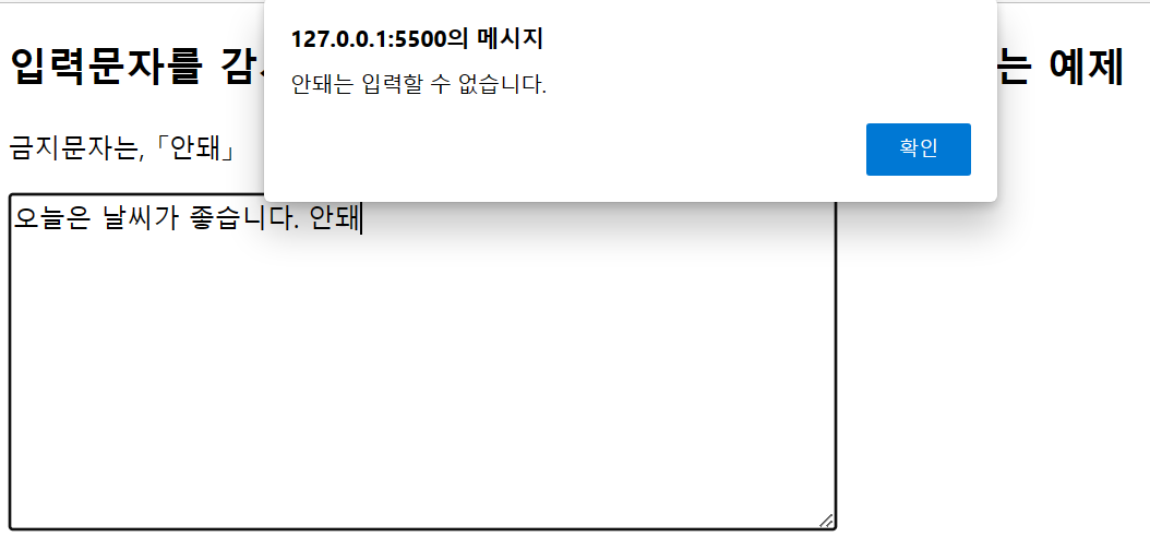'안돼'라는 단어를 입력하면 경고창이 뜨는 예제입니다.