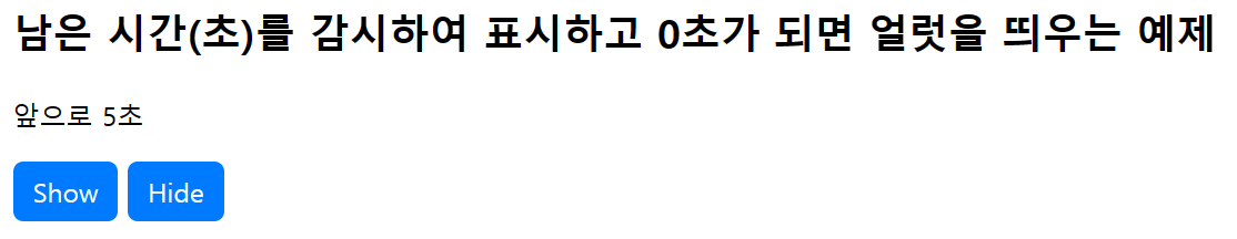 <h2>남은 시간(초)를 감시하여 표시하고 0초가 되면 얼럿을 띄우는 예제</h2>