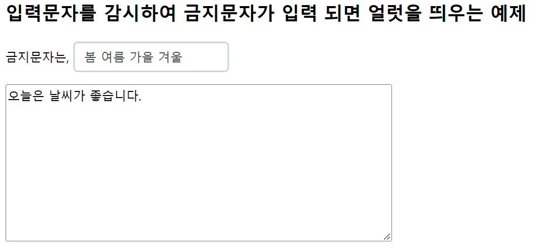 <h2>입력문자를 감시하여 금지문자가 입력되면 얼럿을 띄우는 예제</h2>