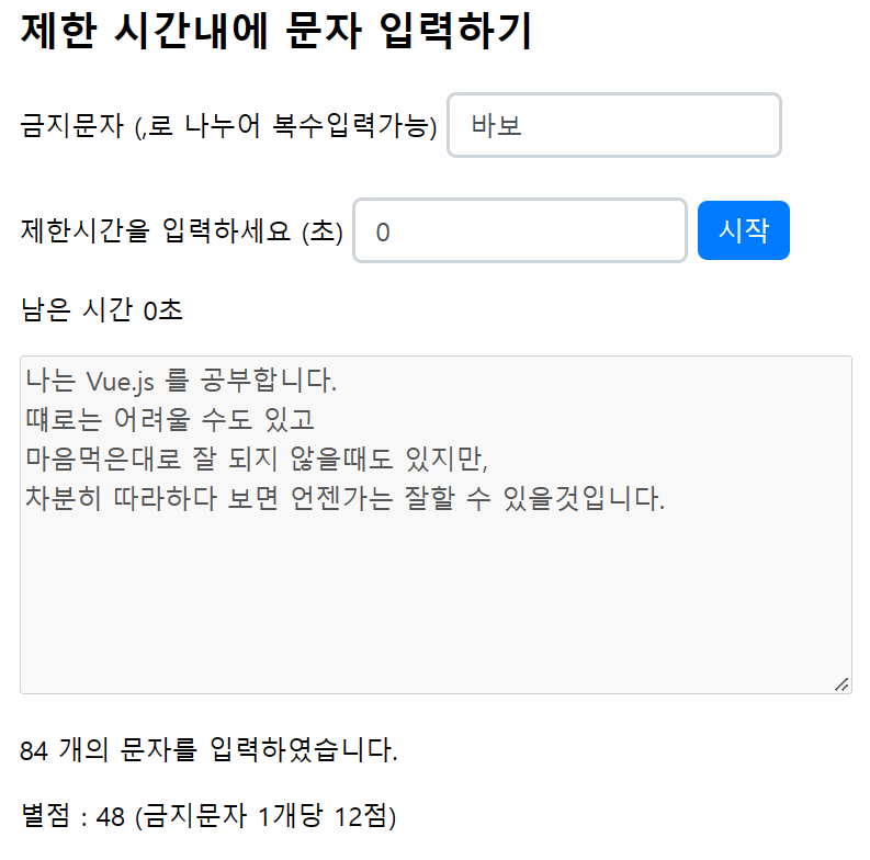 ▷ 제한 시간이 완료되면 텍스트 입력창은 비활성화되고 입력 창 아래 입력한 문자의 개수가 표시되며