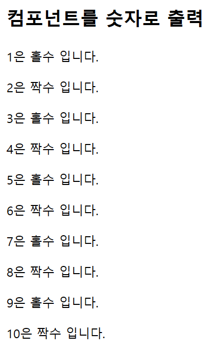 ◎ 컴포넌트를 사용해 1~10까지 출력해 해당 숫자가 짝수인지 홀수인지를 출력하세요