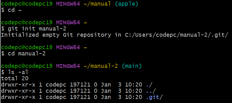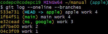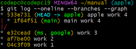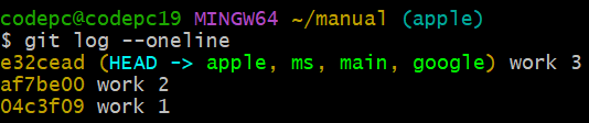 apple로 브랜치를 전환한 후 log를 하면 main은 나타나지 않고 3번째 커밋까지만 나타납니다.