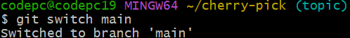 7. 먼저 main 브랜치로 전환 후 topic의 t2 버전만 병합합니다. cherry-pick 명령 다음 t2에 해당하는 커밋 해시 알림