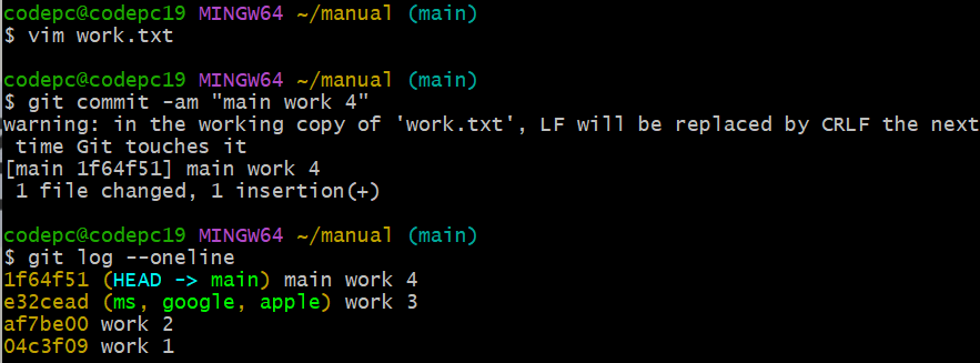 여기까지 main 브랜치에서 work1, main work 2 커밋을 만들었습니다.