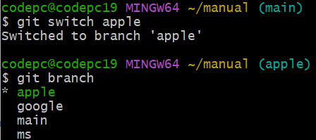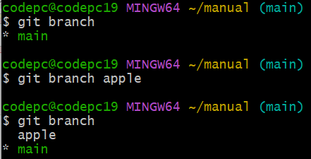branch 추가한 후 log를 하면 아래와 같이 HEAD가 main, apple 모두를 가리키고 있습니다.