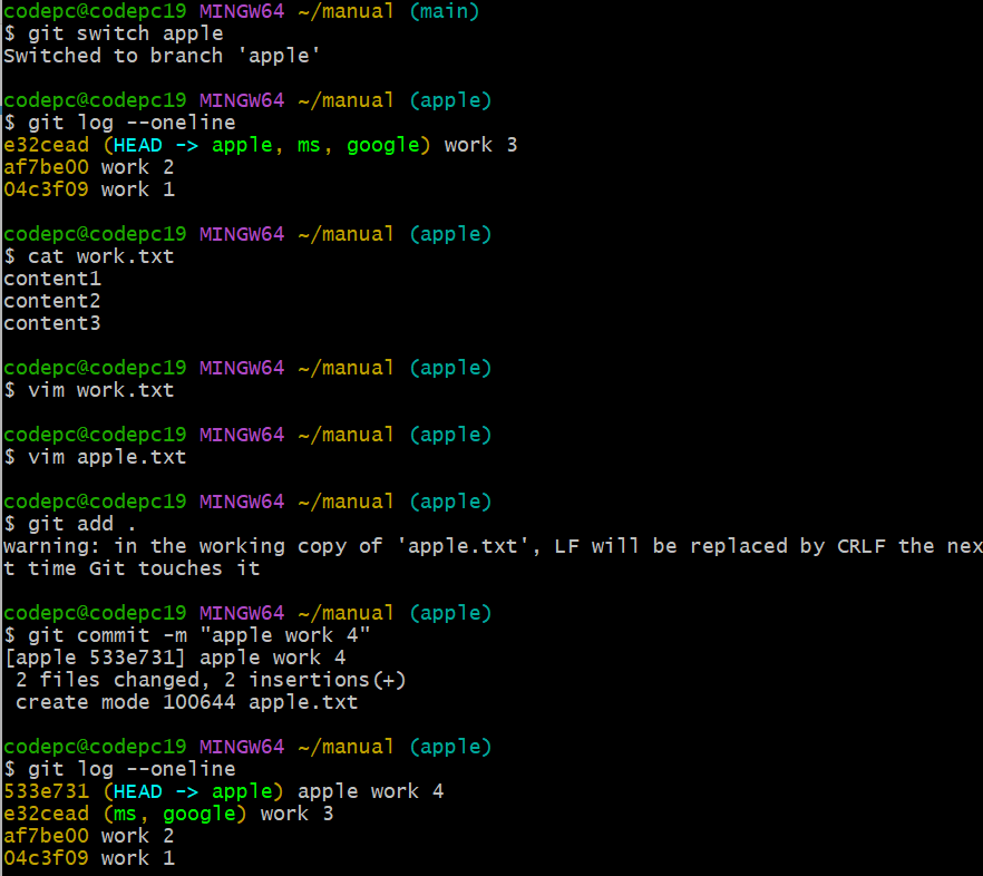 이 후 또 파일 수정 후 커밋하면 apple에서만 네 번째 커밋이 나타납니다.