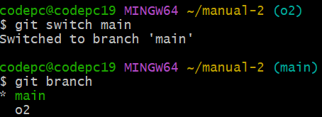 5. o2의 브랜치 내용을 main 브랜치로 병합하기 위해 main 브런치로 전환 후 merge 합니다.