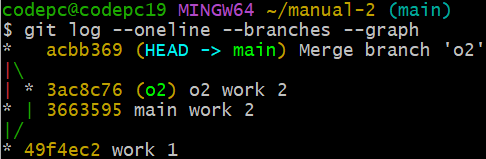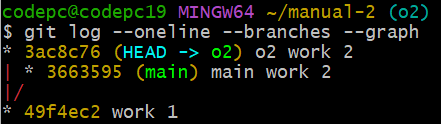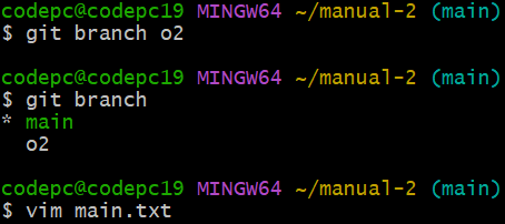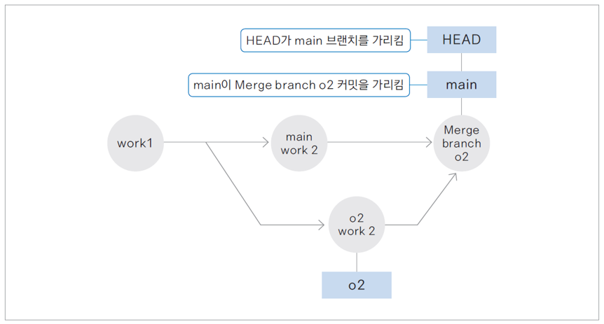 ▷ 병합시에는 git merge 가져올브랜치 main 브랜치 기준으로 o2 브랜치를 병합하려면 '$ git merge o2'