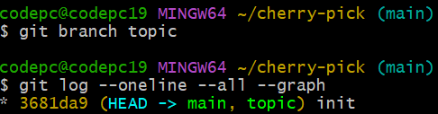 3. 새로운 브랜치 topic을 만들고 깃 로그를 확인하면 init이 main과 topic 브랜치 양쪽에 있습니다.
